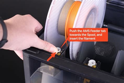 Now, carefully insert the filament into the designated opening in the AMS slot. Gently push the filament until you feel it engage with the internal feeding mechanism. The AMS may make a slight clicking or whirring sound as it pulls the filament in.