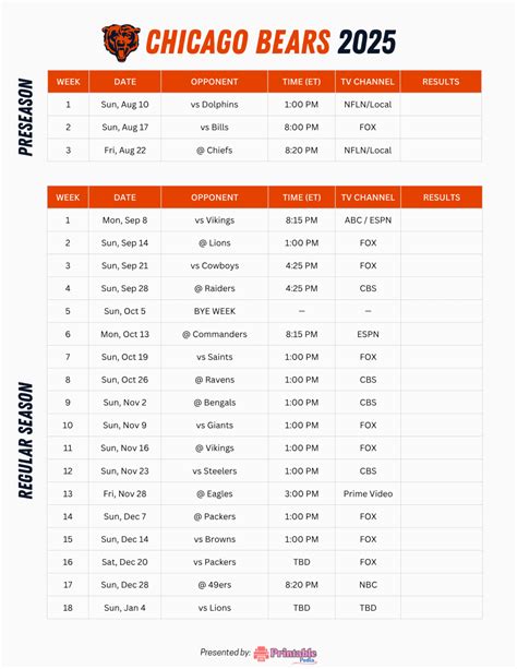 The Chicago Bears 2025 NFL season schedule also features matchups against teams from the AFC, offering a valuable opportunity for the Bears to measure their strength against different conference opponents. These inter-conference games are always intriguing because they bring together unique coaching philosophies, offensive and defensive schemes, and star players from across the league. Facing an AFC opponent can be a significant challenge, as many of these teams boast potent offenses or dominant defenses that have proven successful in their own right. These games serve as a crucial benchmark, showing where the Bears stack up against the broader landscape of the NFL. A strong performance against a top-tier AFC team can boost confidence, prove the Bears’ potential to compete on a national level, and significantly enhance their resume for playoff consideration. Conversely, a poor showing can highlight areas that need immediate improvement before facing similar caliber opponents later in the season or in potential playoff scenarios. The travel involved in these games can also be a factor, with trips to different cities and time zones requiring careful management of the team’s preparation and recovery. Ultimately, these inter-conference matchups are more than just regular-season games; they are opportunities for the Bears to test their mettle, showcase their development, and make a statement against some of the league’s best. They add another layer of excitement and unpredictability to the season, keeping fans on the edge of their seats and providing crucial data points on the team’s journey throughout the year.
