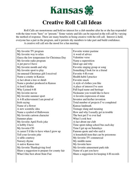 Let’s shake things up with creative prompts! Creative prompts are an awesome way to turn your roll call into a mini-brainstorming session or an opportunity for self-expression. Instead of just saying “Here!”, participants respond to a thought-provoking or imaginative prompt, adding a spark of creativity to the start of your sessions. One fun idea is to use “Would You Rather” questions. These questions can be silly, thought-provoking, or even a little bit controversial. For example, you could ask, “Would you rather have the ability to fly or be invisible?” or “Would you rather live in the past or the future?” These questions spark lively debates and get everyone thinking on their feet. Another great creative prompt is to ask people to complete a sentence. You could start with a phrase like, “If I could have any superpower, it would be…” or “The best thing about today is…” and have each person finish the sentence in their own unique way. This encourages creativity and allows people to share their thoughts and feelings. You can also use visual prompts to spark creativity. Show a picture or a short video clip and ask people to describe what they see, what it makes them feel, or what it reminds them of. This is a great way to engage different parts of the brain and encourage imaginative thinking. Don’t be afraid to get weird or silly with your creative prompts. The more unexpected and unusual they are, the more likely people are to participate and have fun. It’s all about creating a playful and engaging atmosphere that encourages creativity and self-expression. So, brainstorm some creative prompts that are relevant to your group and watch as your roll call transforms into a mini-creative workshop!
