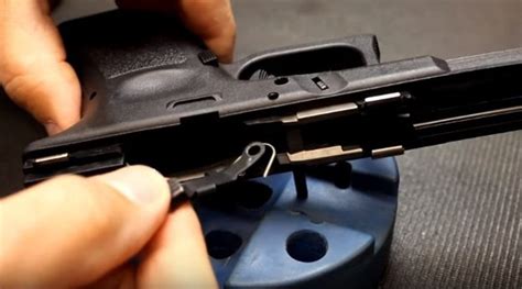 2. Install the Recoil Spring Assembly: Next, install the recoil spring assembly. Place the larger end of the spring assembly against the barrel lug and compress it slightly. Then, guide the assembly into its recess in the slide until it clicks into place.