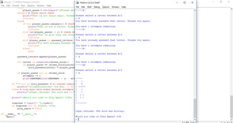 - Update the hangman: Draw a part of the hangman for incorrect guesses.