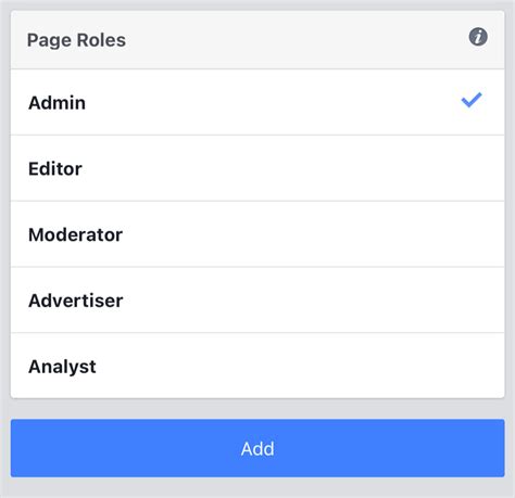7. Click ‘Add’: Once you’ve selected the role, hit the ‘Add’ button. You will likely be prompted to enter your Facebook password to confirm this action. This is a security measure to ensure you’re authorizing the change.