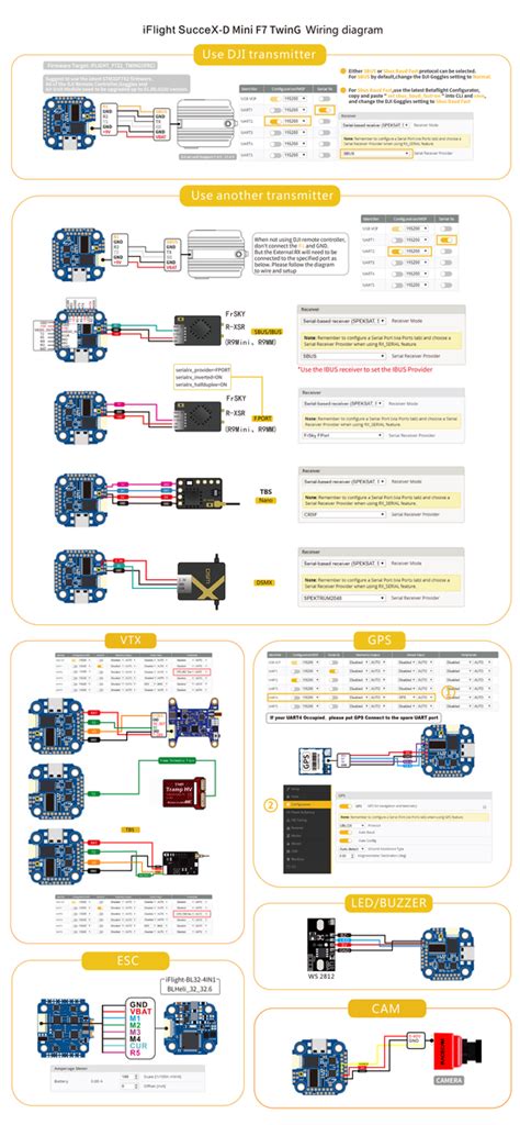 2. Wiring: Connect the necessary components, such as the ESCs (Electronic Speed Controllers), receiver, FPV camera, and video transmitter (VTX), to the corresponding pads or connectors on the FC. Refer to the FC’s wiring diagram for correct connections. Double-check everything!