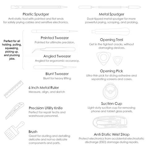 These are usually flat, blunt-edged tools , often made of plastic or sometimes metal. They are incredibly versatile for prying open enclosures, lifting ZIF (Zero Insertion Force) connectors, scraping away old adhesive, and separating components without scratching or damaging the delicate parts around them. Plastic spudgers are preferred for most tasks to avoid damaging sensitive surfaces.
