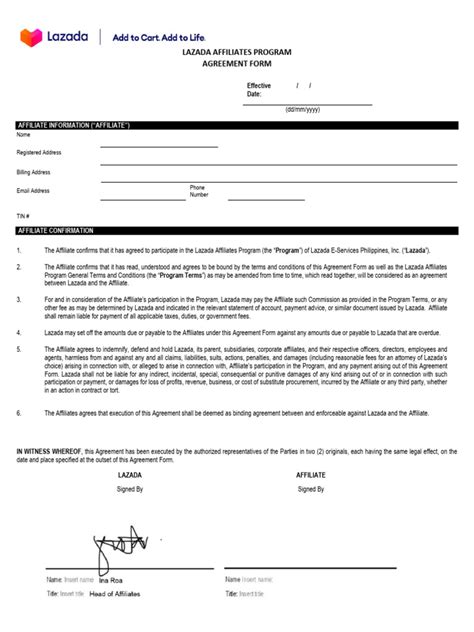 Okay, let’s talk about the Lazada Affiliate Agreement Form . This is the legal document that outlines everything you need to know about your partnership with Lazada. Think of it as the rulebook. It’s super important to understand this agreement, so you know exactly what you’re signing up for. The agreement form typically covers the following key areas: