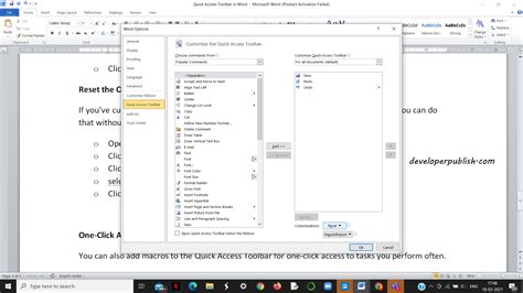 For advanced users, adding macros and custom commands to the Quick Access Toolbar can significantly boost efficiency. If you have created custom macros to automate repetitive tasks, you can add them to the QAT for quick execution. In the Word Options dialog, select “Macros” from the “Choose commands from” dropdown menu, then select your desired macro and click “Add.” Similarly, you can add custom commands or even commands from other Office applications to streamline your workflow further. Macros and custom commands can be powerful tools for automating tasks and increasing productivity in Microsoft Word. By adding them to the Quick Access Toolbar (QAT), you can access them quickly and easily, without having to navigate through menus or remember complex keyboard shortcuts. To add a macro to the QAT, you first need to create or record the macro in Word. Once the macro is created, you can add it to the QAT by following these steps: Go to File > Options > Quick Access Toolbar. In the “Choose commands from” dropdown menu, select “Macros.” A list of available macros will appear in the list below. Select the macro you want to add to the QAT. Click the “Add” button. The macro will now appear in the list of commands on the right side of the dialog box. You can rearrange the order of commands in the QAT by selecting a command and using the up and down arrow buttons. To add a custom command to the QAT, you can follow a similar process. However, instead of selecting “Macros” from the “Choose commands from” dropdown menu, you will need to select “All Commands.” This will display a comprehensive list of all available commands in Word. You can then search for the command you want to add to the QAT and follow the same steps as above. Once you have added macros and custom commands to the QAT, you can customize their appearance by changing their icons. To do this, right-click on the command in the QAT and select “Customize Quick Access Toolbar.” In the dialog box that appears, select the command you want to customize and click the “Modify” button. You can then choose a new icon from the available options or even import your own custom icon. In addition to adding individual macros and custom commands to the QAT, you can also create custom groups of commands. This can be useful for organizing related commands together and making them easier to find. To create a custom group, right-click on the QAT and select “Customize Quick Access Toolbar.” In the dialog box that appears, click the “New Group” button. A new group will be added to the list of commands on the right side of the dialog box. You can then add commands to the group by selecting them from the list on the left side of the dialog box and clicking the “Add” button. Overall, adding macros and custom commands to the QAT is a great way to personalize your Word experience and improve your productivity. By taking the time to customize the QAT to suit your specific needs, you can save time and effort when working on your documents.
