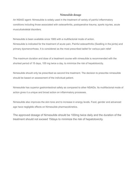 So there you have it, guys! A pretty comprehensive rundown on the nimesulide 100mg dosage . Remember, the standard dose is typically 100mg twice daily, but it’s your doctor who ultimately decides the best course of action for you . They’ll take into account your health history, the condition being treated, and any other medications you’re taking to ensure your safety and the effectiveness of the treatment. Never hesitate to ask questions, and always report any concerns or side effects you experience. Safe medication use is key to feeling better. Stay informed, stay safe, and always prioritize your health!