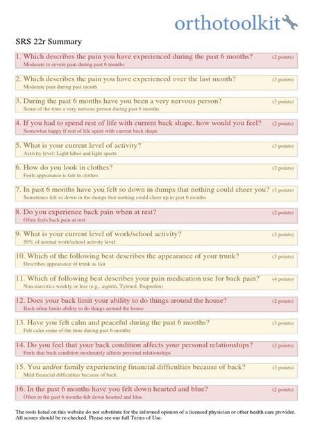 Let’s break down the five essential domains that make up the SRS-22 questionnaire. Understanding each one is key to accurate SRS-22 score interpretation . First up, we have Pain . This section assesses the frequency and severity of back pain experienced by the patient. It helps clinicians understand how much discomfort scoliosis is causing and whether it’s a significant limiting factor in their daily lives. Next is Appearance . This is a really sensitive area, as it focuses on how the patient perceives their body image and the visible effects of scoliosis, like posture and symmetry. For many, especially adolescents, this can be a major source of distress. Then comes Activity . This domain looks at the patient’s ability to participate in physical activities and daily routines. It helps gauge functional limitations and how scoliosis might be impacting their ability to engage in sports, hobbies, or even simple tasks. Following that is Psychological factors . This delves into the emotional and mental impact of scoliosis. It assesses feelings of self-consciousness, worry, depression, and overall mental well-being related to the condition. Finally, we have Satisfaction with Treatment . This domain is crucial for evaluating how patients feel about the management plan they are receiving, including any previous treatments or interventions. It captures their satisfaction with their healthcare providers and the perceived effectiveness of their care. Each of these domains contributes to the overall SRS-22 score, but they also provide granular insights into specific aspects of a patient’s life. By analyzing the scores within each domain, we can get a much clearer picture of the patient’s lived experience and identify areas that might require targeted support or intervention. It’s this detailed breakdown that makes the SRS-22 so valuable in providing personalized care for individuals with scoliosis. Remember, higher scores in each domain generally indicate better outcomes.