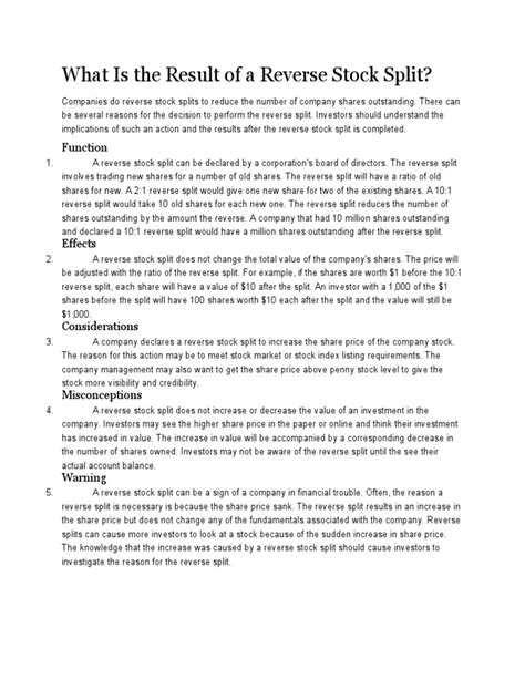 Before you jump to conclusions about a reverse stock split, let’s chat about some potential pitfalls and considerations for investors . While the split itself doesn’t change your investment’s value, the reasons behind it and the subsequent market reaction can be significant. Guys , one of the biggest concerns is that a reverse split is often a symptom of underlying business weakness. If the company couldn’t maintain its stock price through strong performance, simply boosting the price via a split doesn’t fix operational issues, debt problems, or competitive disadvantages. Many stocks that undergo reverse splits continue to decline in price post-split, as the market recognizes that the fundamental problems haven’t been addressed. Another major consideration is the impact on liquidity and trading. While the goal might be to attract institutional investors, a higher share price can sometimes make the stock less accessible to retail investors who prefer buying in smaller increments. This can lead to reduced trading volume and wider bid-ask spreads, making it harder to buy or sell shares without significantly impacting the price. For those holding fewer shares, the issue of fractional shares can also be a drawback. If the company cashes out fractional shares, you might be forced to sell a small portion of your holding at a price that might not be favorable, and you lose the potential upside from that fraction. It’s also worth remembering the psychological impact. While a higher price might seem good, it can also set a higher bar for future price appreciation. If a stock goes from \(1 to \) 10 after a split, it needs to double to \(20 to achieve a 100% gain, whereas before the split, a doubling would have taken it from \) 1 to $2. This can make perceived gains seem smaller. Finally, always scrutinize the company’s overall strategy. Is the reverse split a standalone event, or is it part of a broader, credible plan for improvement? If management is simply using it as a band-aid, it’s a major red flag. Investors should be wary of companies that repeatedly resort to reverse splits without showing consistent improvement in their core business. It’s crucial to understand why the company felt the need for this action and what its prospects are beyond the split.