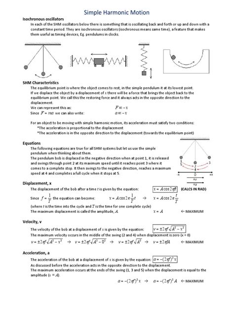 Let’s zoom in on Simple Harmonic Motion (SHM) because it’s such a cornerstone concept, guys. As we touched on, SHM is a special type of harmonic motion where the acceleration is directly proportional to the displacement from equilibrium and is always directed towards equilibrium. The classic setup is a mass attached to an ideal spring. When you pull the mass away from its resting point, the spring pulls it back with a force ( \(F = -kx\) ), where \(k\) is the spring constant and \(x\) is the displacement. This force causes acceleration ( \(a = F/m = -(k/m)x\) ). Because \(k\) and \(m\) are constant, the acceleration ( \(a\) ) is directly proportional to the displacement ( \(x\) ) and in the opposite direction. This relationship leads to motion that can be described by a sine or cosine function. The equation of motion for SHM is \(d^2x/dt^2 = -\omega^2x\) , where \(\omega = \sqrt{k/m}\) is the angular frequency. The period ( \(T\) ) of SHM is \(T = 2\pi/\omega = 2\pi\sqrt{m/k}\) , and the frequency ( \(f\) ) is \(f = 1/T = (1/2\pi)\sqrt{k/m}\) . Notice how the period and frequency depend only on the mass and the spring constant, not on the amplitude. This is a key characteristic of SHM – the time it takes for one full cycle is independent of how far you pull the spring. The amplitude is simply the maximum displacement from the equilibrium position. Energy in SHM is continuously converted between kinetic energy (when the mass is moving fastest at the equilibrium) and potential energy (when the mass is momentarily at rest at its maximum displacement). In an ideal system with no friction, the total mechanical energy (kinetic + potential) remains constant. SHM is crucial because many physical systems, when slightly disturbed, approximate SHM. Examples include a simple pendulum (for small angles), the vibration of a tuning fork, and even the oscillating electric and magnetic fields in electromagnetic waves. Understanding SHM allows us to model and predict the behavior of a vast range of physical phenomena with remarkable accuracy.