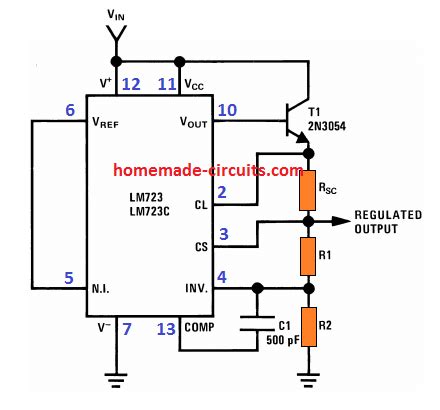 , typically a NPN power transistor like a 2N3055. In this setup, the output of the LM723 (pin 10) drives the base of the external transistor, while its collector connects to the unregulated input and its emitter provides the high-current regulated output. This extends the current capability well beyond the internal 150mA, allowing for several amps of output current. The beauty of this