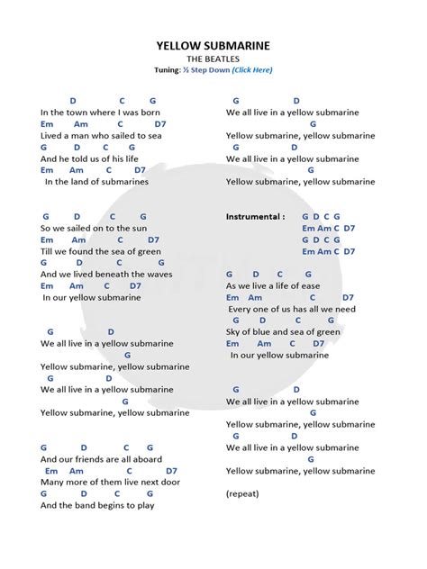 Now that you know the Yellow Submarine chords and a suitable strumming pattern, let’s put it all together and play the song! Start by tuning your instrument and warming up your fingers. Then, review the chord progression and strumming pattern to make sure you have them memorized. When you’re ready, start playing slowly and focus on making clean and smooth chord changes. Use a metronome to keep a steady beat, and gradually increase the tempo as you become more comfortable. Remember, consistency is key. The more you practice, the easier it will become. And don’t be afraid to make mistakes. Everyone makes mistakes when they’re learning something new. The important thing is to learn from your mistakes and keep practicing. As you become more confident, you can start adding your own personal touches to the song. Experiment with different strumming patterns, add some embellishments, or even try singing along. The goal is to make the song your own and have fun in the process. And don’t forget to share your music with others. Play for your friends, your family, or even post a video online. Sharing your music is a great way to connect with others and inspire them to pursue their own musical passions. So grab your guitar, put on your Yellow Submarine hat, and start playing! With a little practice and a lot of enthusiasm, you’ll be playing this classic song like a pro in no time. And who knows, maybe you’ll even inspire others to join in and create their own musical masterpieces.